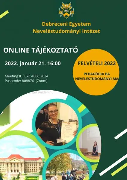 2021. január 21-én (pénteken) 16:00-tól várunk minden érdeklődőt az online felvételi tájékoztatón! A tájékoztatón bemutatjuk a Pedagógia BA és Neveléstudományi MA képzéseinket, a felvételi menetét és megosztunk Veled minden fontos információt a jelentkezéssel kapcsolatban.