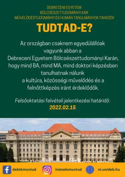 Az országban csaknem egyedülállóak vagyunk abban a Debreceni Egyetem Bölcsészettudományi Karán, hogy mind BA, mind MA, mind doktori képzésben tanulhatnak nálunk a kultúra, közösségi művelődés és a felnőttképzés iránt érdeklődők.