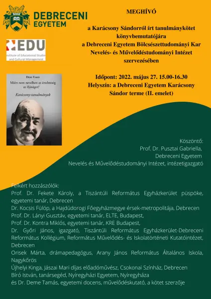 A könyvbemutató Deme Tamás frissen megjelent pedagógiai kötetére épül, amelynek a címe: Miért nem nevelheti az értelmiség az ifjúságot? A kötet az Orpheusz Kiadó gondozásában jelent meg. A könyvbemutatóval tisztelgünk egyetemünk egykori professzora, Karácsony Sándor előtt, születésének 130., halálának 70. évfordulója alkalmából.