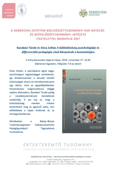 A különbözőség pszichológiája és differenciáló pedagógia c. könyv bemutatója.